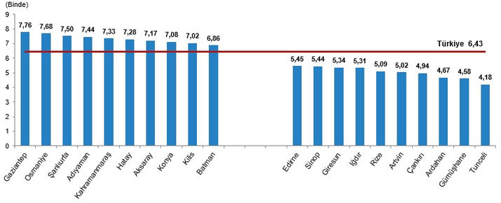 Kaba evlenme hızının 2025 yılında en yüksek olduğu il binde 7,76 ile Gaziantep oldu. Gaziantep’i Osmaniye ve Şanlıurfa izledi. En düşük evlenme hızı ise binde 4,18 ile Tunceli’de kaydedildi. Tunceli’yi Gümüşhane ve Ardahan takip etti.