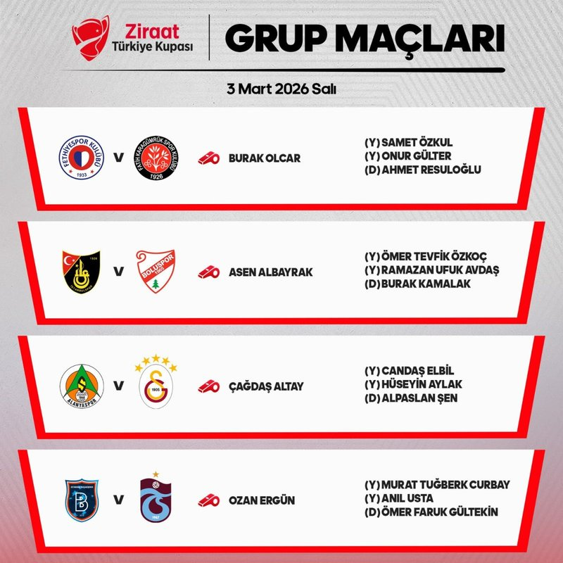 Ziraat Türkiye Kupası’nda 4. hafta kapsamında 3 Mart Salı günü oynanacak dört karşılaşmanın hakemleri açıklandı. Galatasaray’ın Corendon Alanyaspor deplasmanındaki maçını Çağdaş Altay, RAMS Başakşehir ile Trabzonspor arasındaki mücadeleyi ise Ozan Ergün yönetecek.