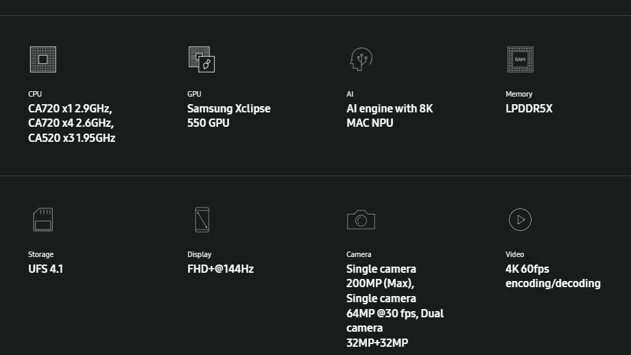 Multimedya tarafında ise 200 megapiksele kadar kamera desteği, 4K 60 FPS 10-bit HDR video kaydı ve 144Hz yenileme hızına sahip Full HD+ ekran desteği dikkat çekiyor.