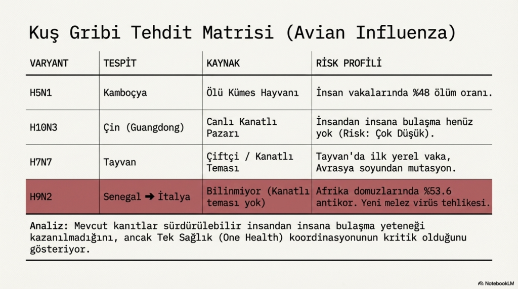 2026 yılında küresel sağlık gündeminde kuş gribi varyantları ve farklı salgın hastalıklar öne çıkıyor. İtalya’da ilk kez dış kaynaklı H9N2 vakası tespit edilirken, Tayvan’da H7N7, Kamboçya’da H5N1 ve Çin’de H10N3 varyantları insanlarda görüldü. Bu gelişmeler, virüslerin hayvandan insana bulaş riskinin sürdüğünü ve gözetim sistemlerinin önemini bir kez daha ortaya koyuyor.