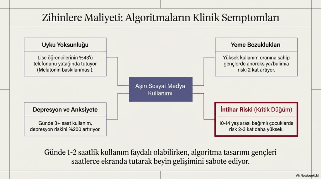 Aşırı kullanım; depresyon ve anksiyete riskini artırırken, intihar eğilimi ve kendine zarar verme davranışlarında da yükselişe neden oluyor. Ayrıca sosyal medyada sunulan idealize edilmiş içerikler, gençlerde beden algısı bozukluklarını ve yeme problemlerini tetikliyor.