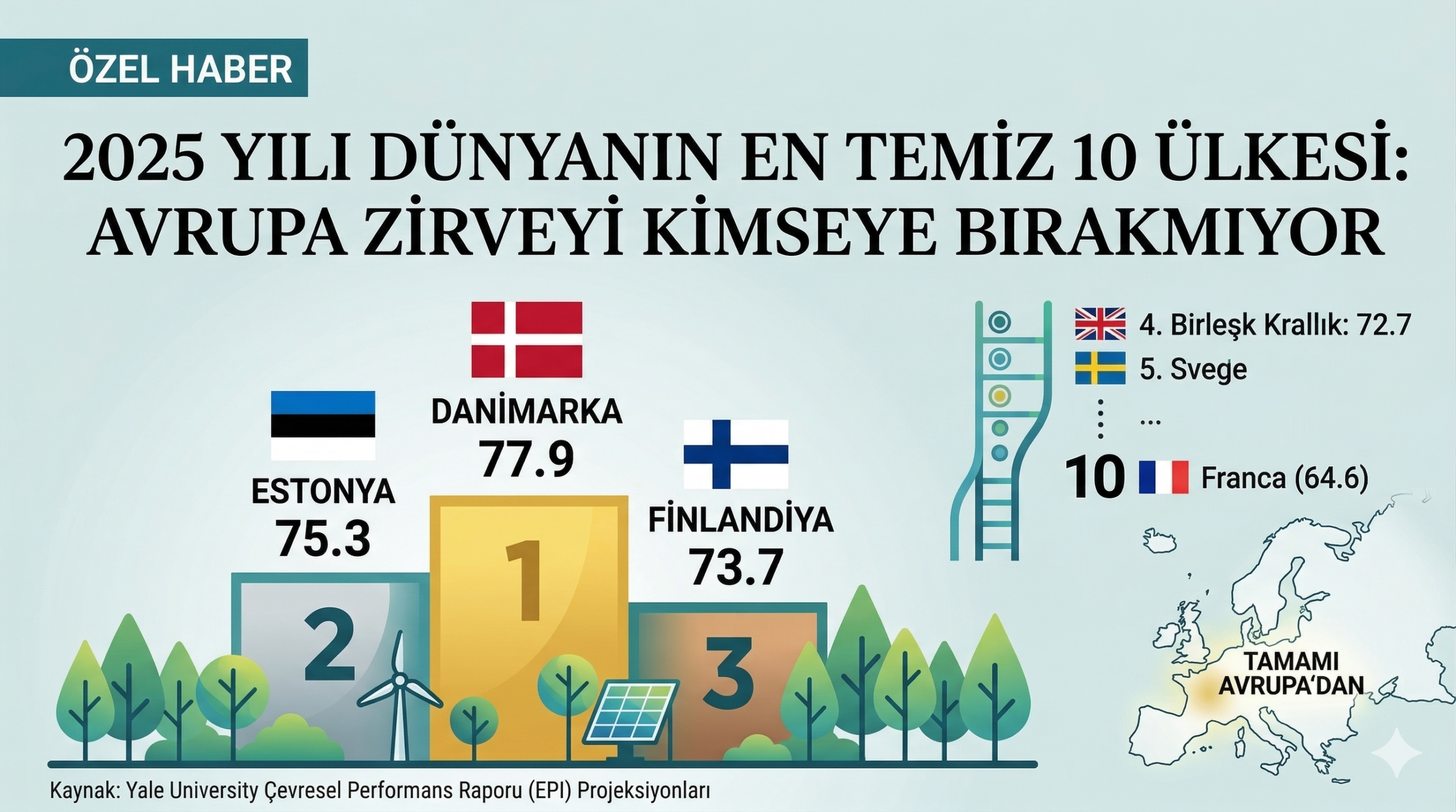 Yale Üniversitesi’nin hazırladığı 2025 Çevresel Performans Raporu’na göre, sürdürülebilirlik ve çevre sağlığı konusunda dünyanın en başarılı 10 ülkesi belli oldu. Listenin tamamının Avrupa ülkelerinden oluşması dikkat çekti.