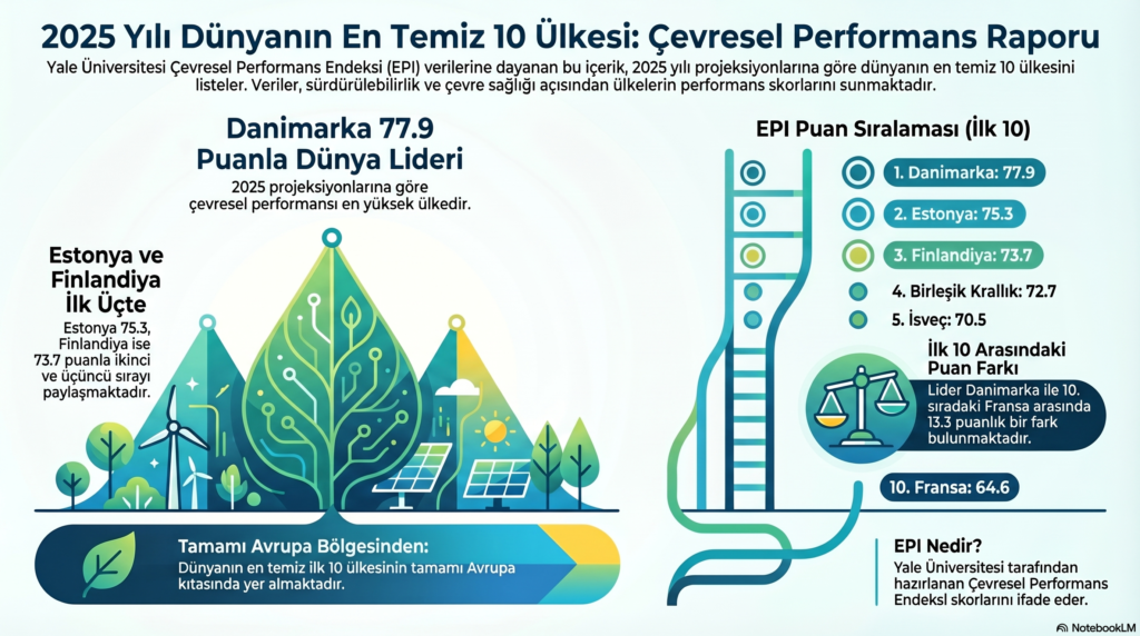 2025 yılı projeksiyonlarına dayanan verilerde, Danimarka 77.9 puanla listenin zirvesinde yer alıyor. Çevre sağlığı ve ekosistem canlılığı gibi kriterlerde en yüksek skoru alan ülke, küresel yeşil dönüşümün öncüsü olmaya devam ediyor.